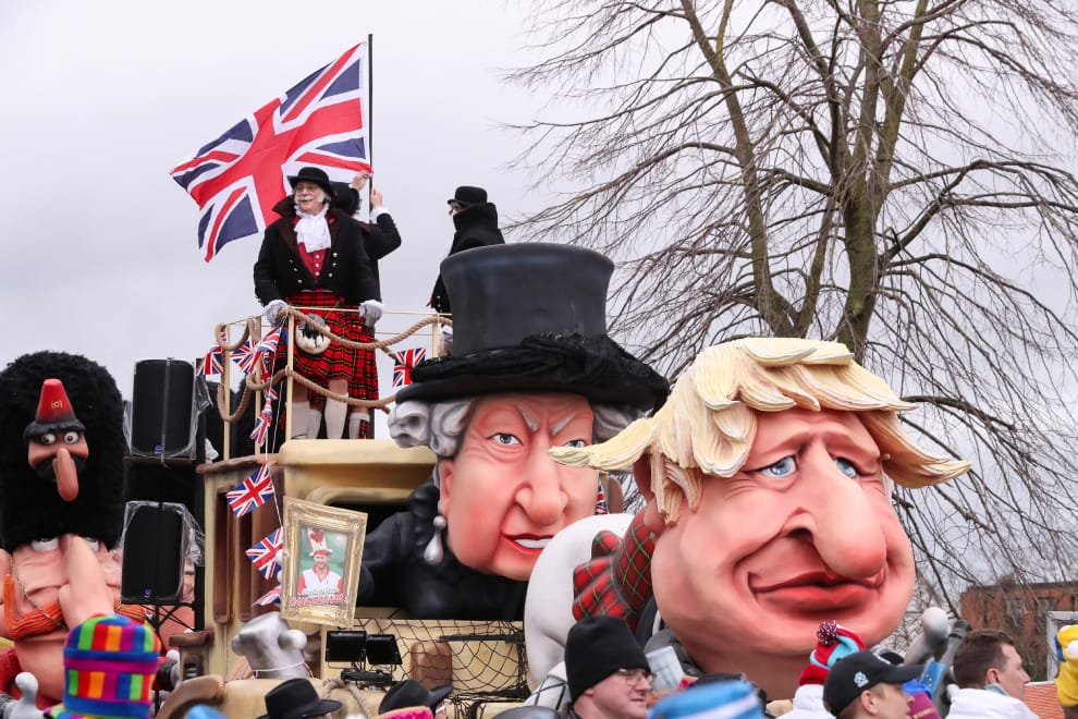 在比利時北部城市阿爾斯特(Aalst),當地正在舉辦花車嘉年華,在活動現場可以看到英國首相強生(Boris Johnson)和英國女王伊莉莎白二世(Queen Elizabeth II)的花車。