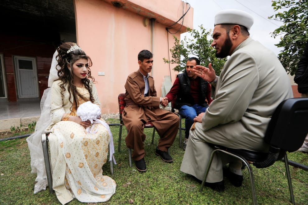26歲的贊農(Hussain Zeeno Zannun)與 16歲的妻子查哈德(Chahad)在婚禮當天聆聽伊瑪目的教誨。傳統的伊拉克婚禮會為新娘準備大量黃金首飾,使她看起來更加亮麗。