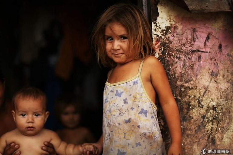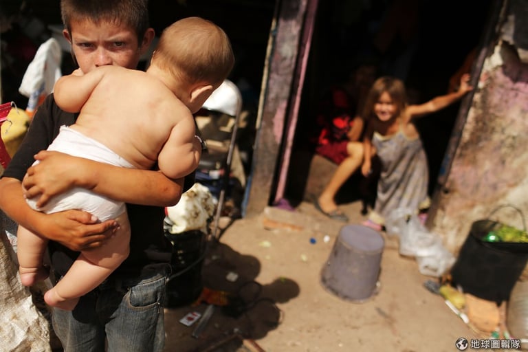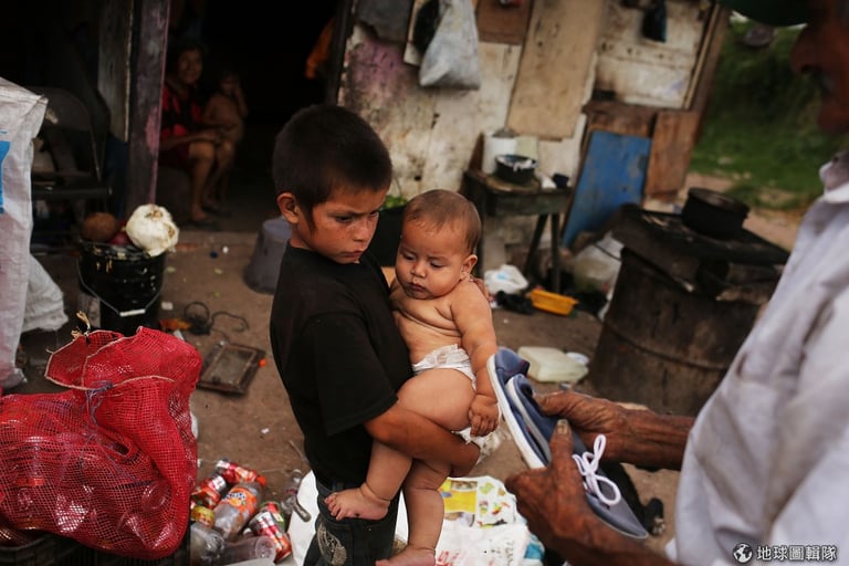 男孩抱著他的弟弟,他與家人們就住在垃圾場旁的矮房中,他們以販賣從垃圾場搜羅來的回收物還有其他雜物為生。圖片來源: Spencer Platt/Getty Images