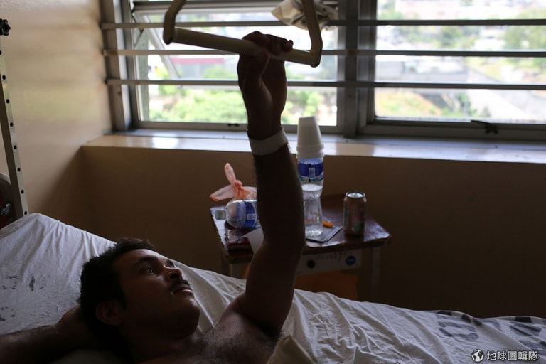 名叫「璜‧貢薩雷斯」(Juan Gonzalez) 的男子躺在病床上休息,他因為一場搶案中中彈。圖片來源: Spencer Platt/Getty Images