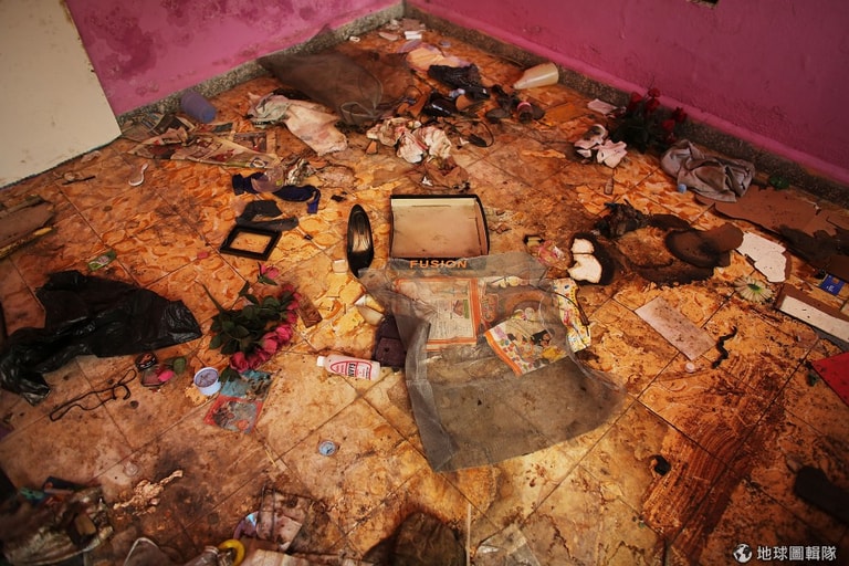 一間滿佈血跡與四散物品的房間,不久前住在這的一名女性在睡夢中被幫派份子開槍打死。圖片來源: Spencer Platt/Getty Images