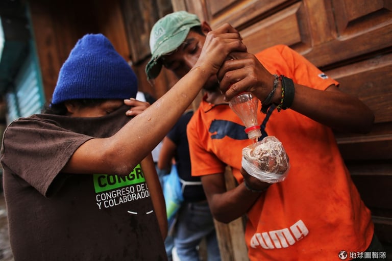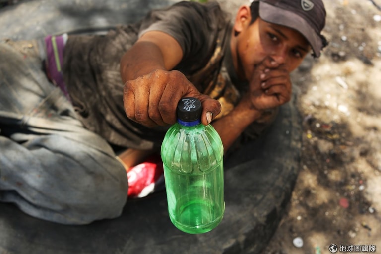以街頭為家的年輕人,手拿他與朋友們用來吸食用的油漆稀釋劑。圖片來源: Spencer Platt/Getty Images