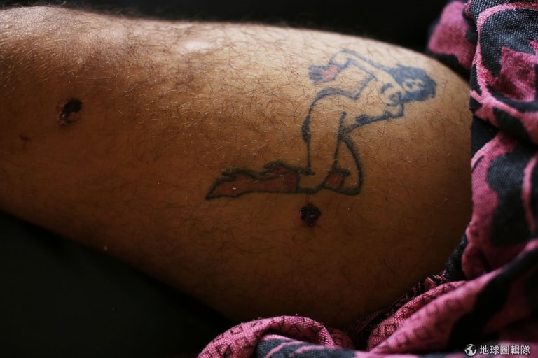 名叫「馬汀內茲」的男子(Selbyn Anthony Martinez),這是他中彈的大腿,他在一場搶劫中受傷。圖片來源: Spencer Platt/Getty Images