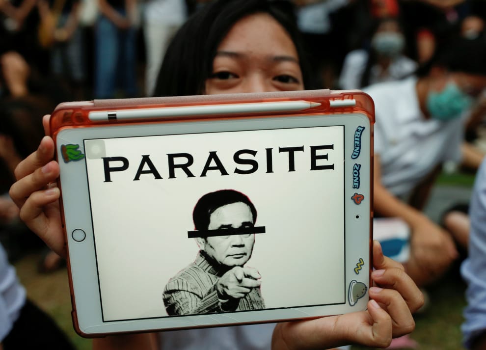 在曼谷外圍的瑪希敦大學,學生們齊聚一堂抗議泰國憲法法院下令第二大反對黨「未來前進黨」(Future Forward Party)解散的決定。其中,一名抗議學生手舉泰國總理帕若育(Prayuth Chan-ocha)被馬賽克的照片,上頭寫上「寄生蟲」,藉此諷刺帕若育是「未來前進黨」遭解散的幕後主使。