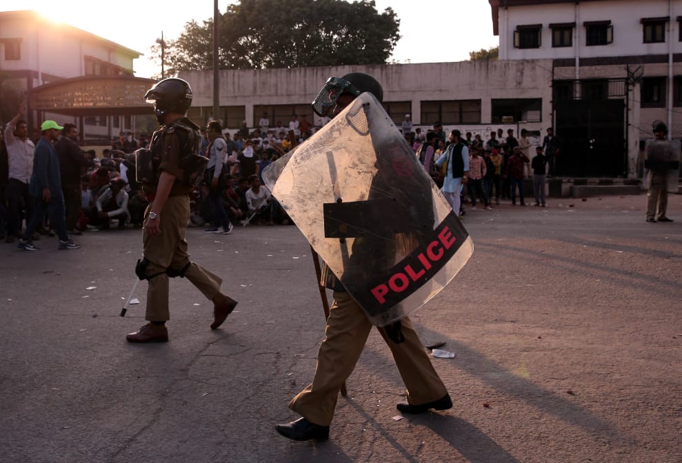 在新德里街頭,警察手拿盾牌和長棍巡邏,這裡剛剛經歷了一場因為《公民身份修正法案》(Citizenship Amendment Bill,CAB)而起的街頭大亂鬥。