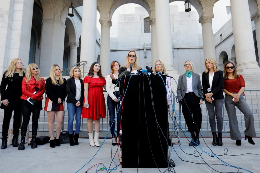在加州洛杉磯市政廳外,「打破沉默者」(The Silence Breakers)正在舉行記者會,談論好萊塢前王牌製片韋恩斯坦(Harvey Weinstein)被以「三級強暴罪」、「一級犯罪性行為」定罪的消息,她們都是遭到韋恩斯坦性騷擾的受害者。