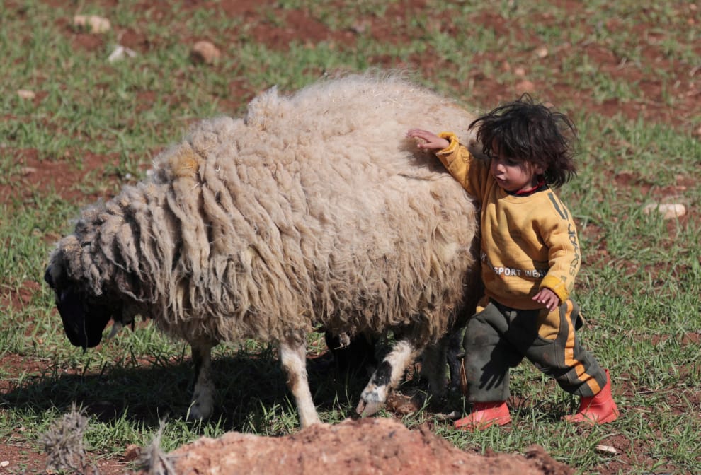 在設立臨時難民營的阿扎茲鎮(Azaz),一名流離失所的小孩正在與綿羊玩耍。