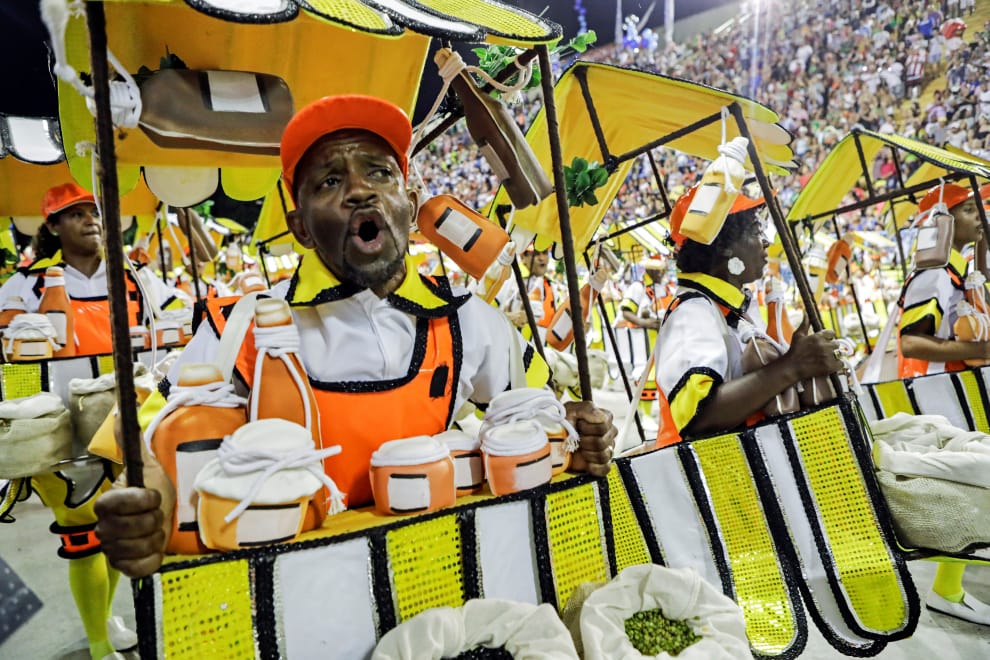在里約熱內盧舉辦的森巴嘉年華上,參加者將自己打扮成街頭小販遊行。