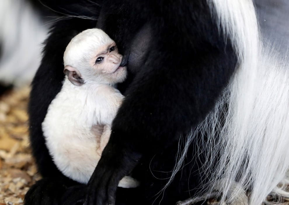 在布拉格動物園內,可以看到一對東黑白疣猴母子。其中,小東黑白疣猴正在吃飯中。
