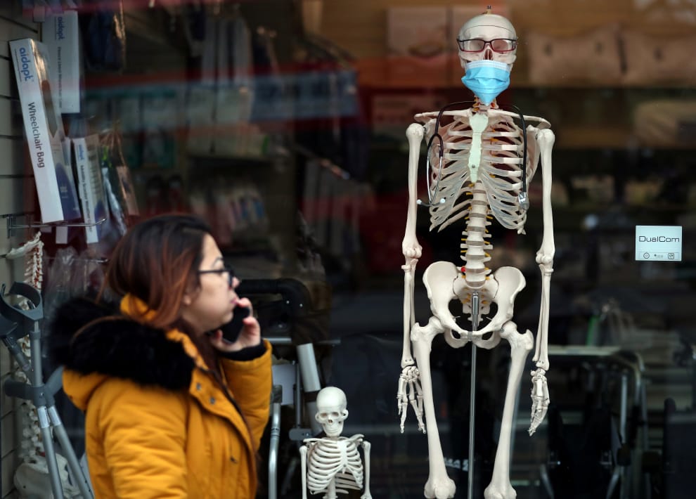 在倫敦南部的一家醫療器材行內,老闆將店內擺放的骷髏戴上了口罩,呼籲民眾做好 2019新型冠狀病毒(2019-nCoV)的防疫準備。