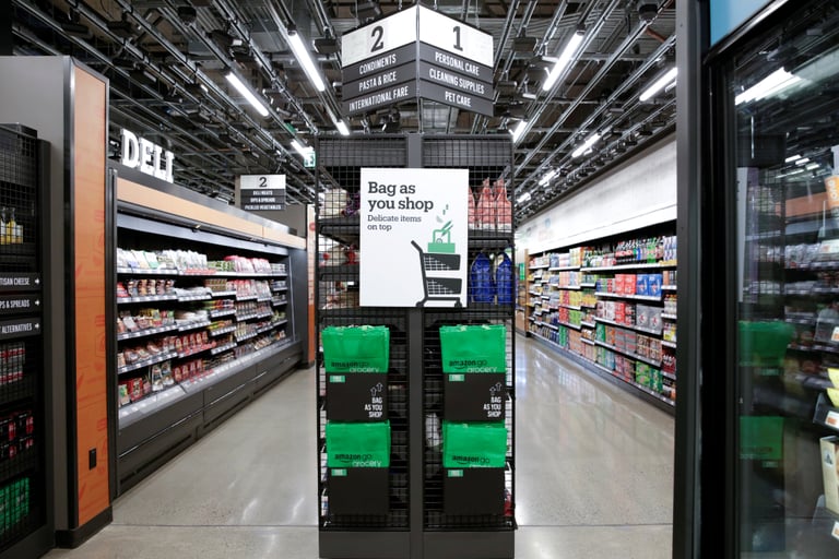 亞馬遜無人超市名為 Amazon Go Grocery,主要販賣生鮮食品,首間門市開在亞馬遜總部所在地西雅圖,距離總部辦公室約 1 英里,門市面積約 1 萬平方英尺。無人超市的規模在 Amazon Go 與 Whole Foods 超市之間,商品庫存約 5,000 件,面積比 Amazon Go 大 5 倍,約 Whole Foods 超市三成。