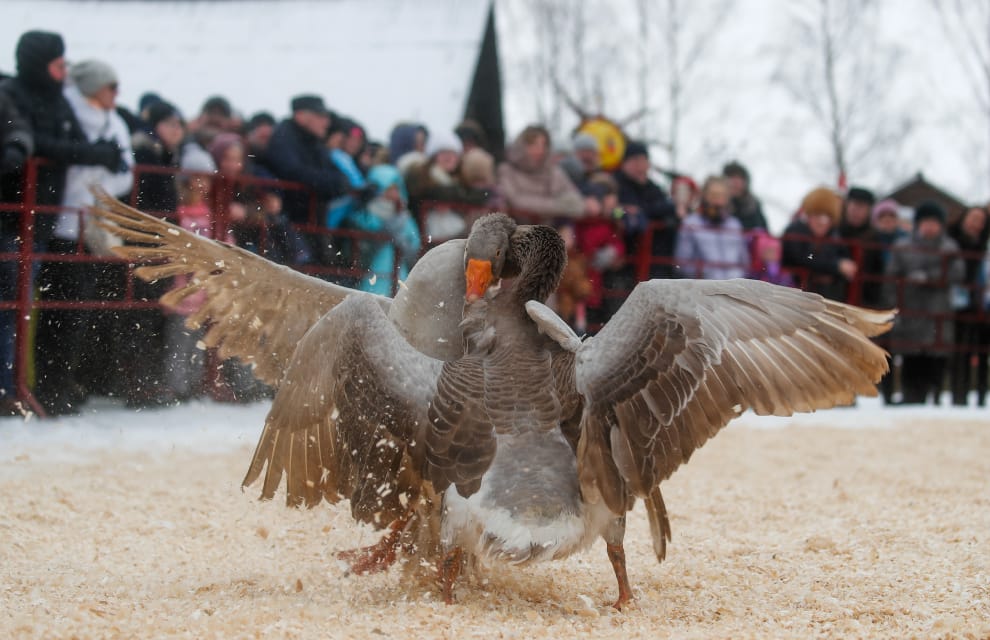 在位於俄國西部的蘇茲達爾鎮(Suzdal),當地正在舉辦謝肉節(烤薄餅周)的傳統活動「鬥鵝」。