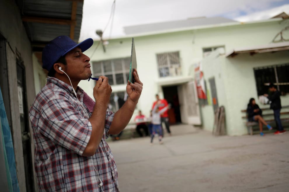 在美墨邊境的華瑞茲城(Ciudad Juárez),一名來自中美洲的移民正在耶穌是好牧人收容所(El Buen Pastor shelter)中刮鬍子。