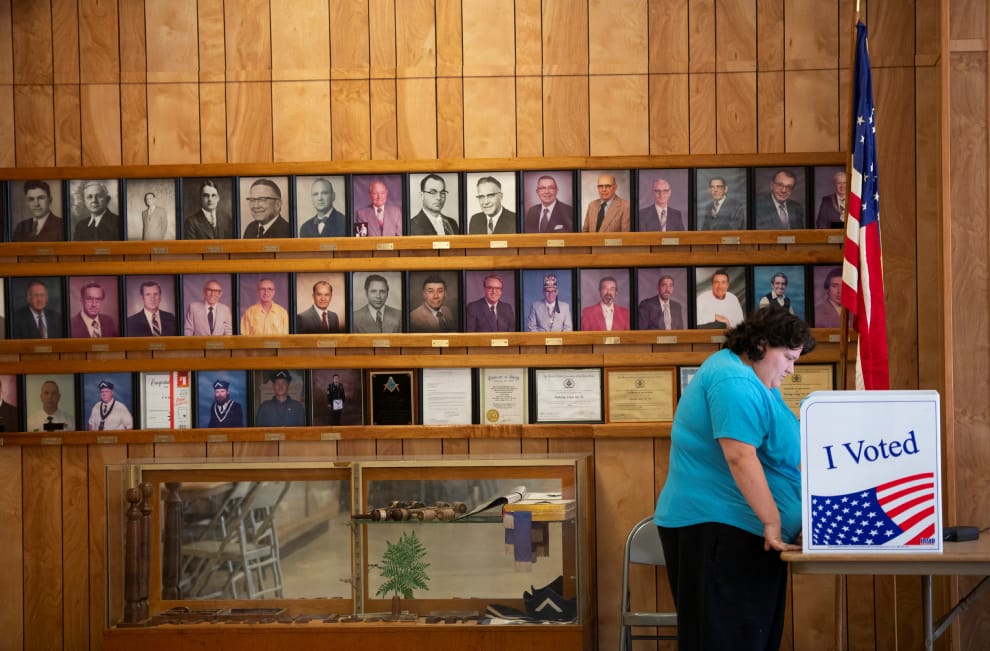 在美國南卡羅來納州(South Carolina)的投票所內,一名女子在民主黨總統候選人初選中投票給她所支持的候選人。