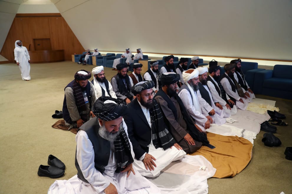 在卡達的杜哈(Doha),阿富汗恐怖組織塔利班的代表團成員一同聚集禮拜,為接下來將要與美國簽訂的和平協議祈禱,希望簽訂過程一切順利。