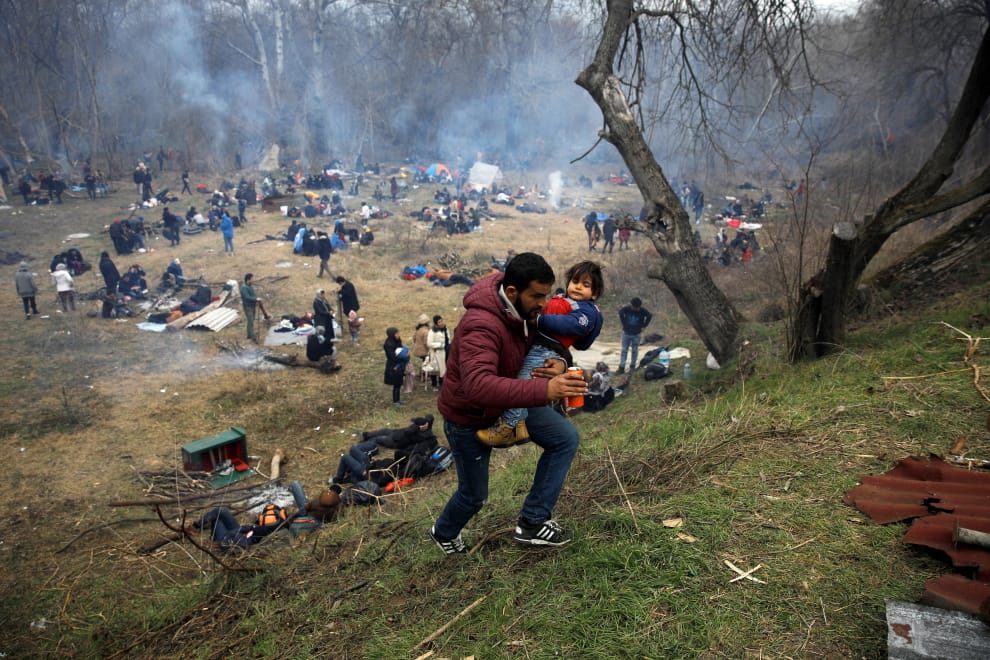 土耳其邊境帕扎庫勒地區(Pazarkule)的一名難民,帶著自己的孩子奮力跑上山坡,希望能趁著土耳其好不容易開放邊境的機會進入歐洲,為自己和家人爭取一個更好的生活環境。