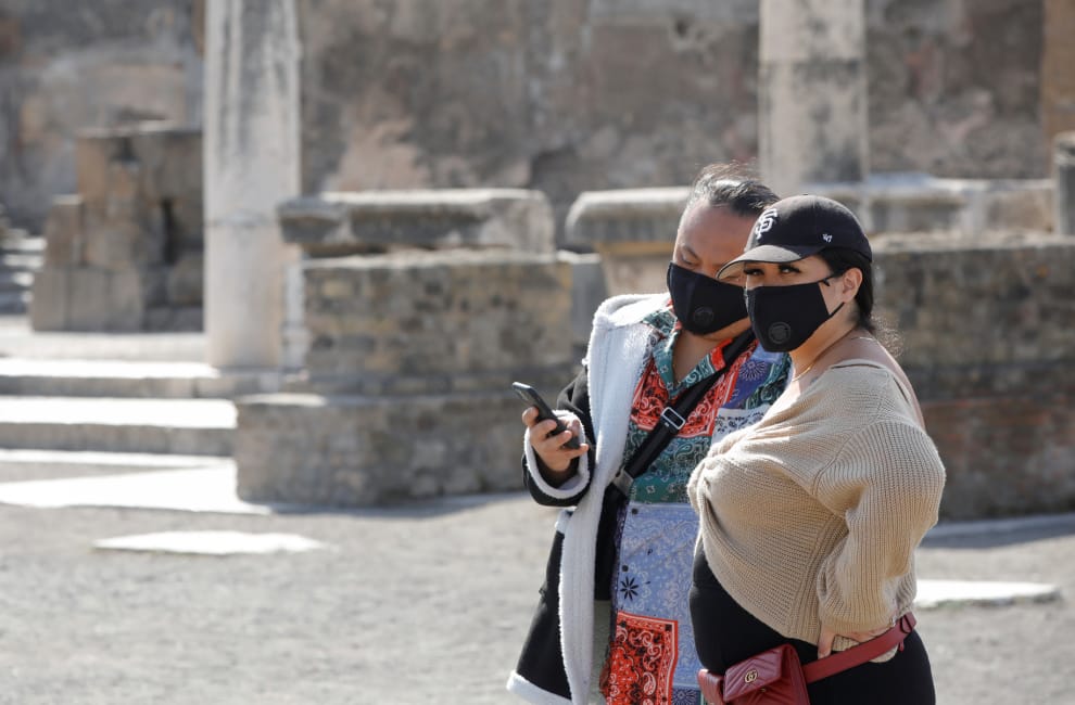 在義大利知名景點龐貝古城(Pompeii),兩名遊客不忘戴上口罩,嚴防全球蔓延的 2019新型冠狀病毒(2019-nCoV)疫情。