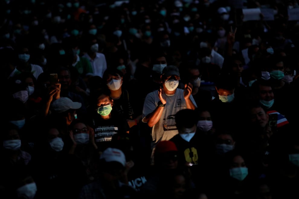 在泰國的首都曼谷,泰國農業大學(Kasetsart University)學生晚間舉辦集會,抗議最高法院下令解散泰國的第二大反對黨:「未來前進黨」(Future Forward Party)。