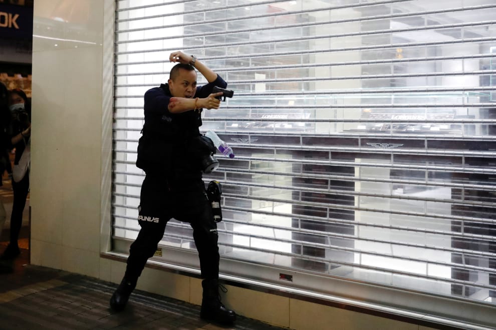 晚間,在香港旺角一群人自發性地集會、獻花,紀念半年前抗議群眾與警方在港鐵太子站爆發的流血衝突。一名鎮暴警察舉起槍枝,試圖驅散群眾。