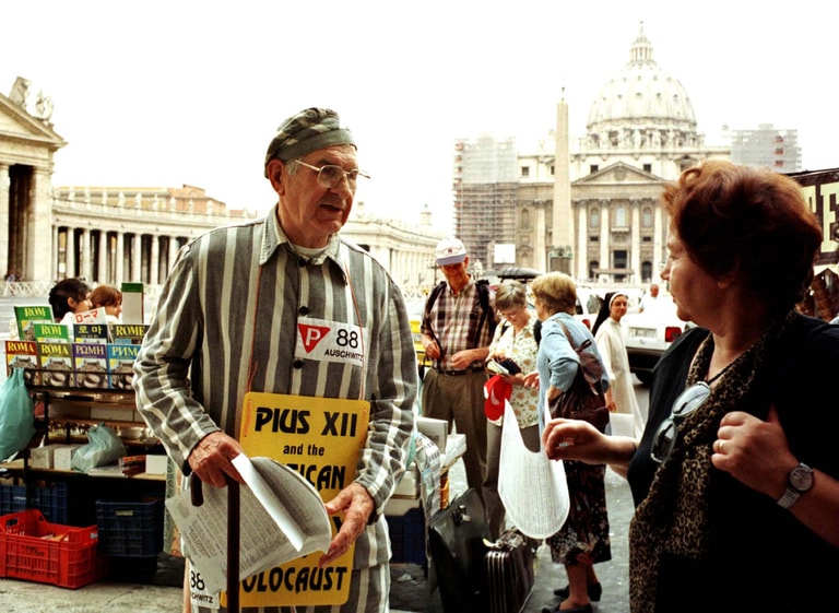 「雖然有許多證據顯示,教會真的有在羅馬保護猶太人,不過在 1943年10月16日,超過 1,000名猶太人待在羅馬兩天後,隨即就被送往集中營。然而庇護十二世對此卻沒有公開抗議,就連私底下他也不願請求希特勒(Adolf Hitler)停止把猶太人送往奧斯威辛集中營。」