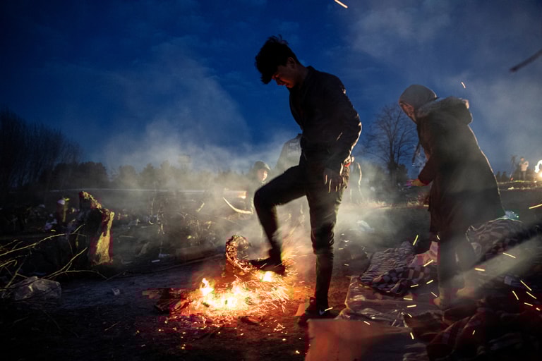 在土耳其北部邊境的小鎮埃迪爾內(Edirne),一名難民在埃佛羅斯河(Evros river)河岸生火取暖。