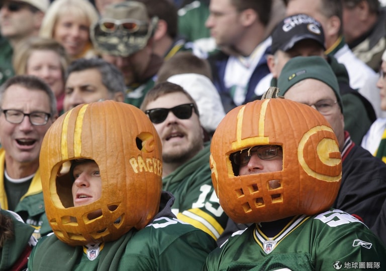 威斯康辛州的球迷熱情也不忘應景,把南瓜雕刻成的安全帽戴在頭上。