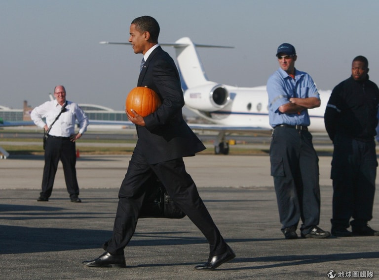 雖然因為要出席正式場合換上一身黑,但美國總統歐巴馬還是很應景的抱著一顆南瓜坐上他的總統專機。