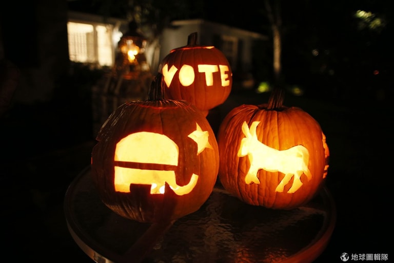 美國加州的民宅前有人用選舉當主題雕刻南瓜,點亮的南瓜燈在夜色中特別亮眼。