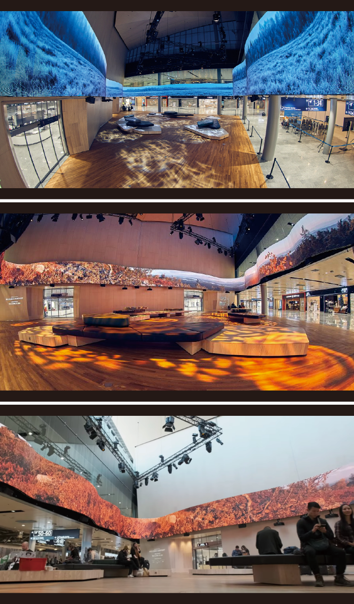 最近完工的Aukio公共廣場空間,由77公尺、長2米高的波浪型360度LED螢幕景觀所環繞,螢幕上呈現芬蘭四季的豐富樣貌,這些風景全數來自境內的國家公園。此外,高科技互動體驗牆的設計,讓民眾能更深入了解芬蘭的自然風光,無論是稍縱即逝令人讚嘆的極光,或是一片寧靜無漪的湖水,都能讓旅客徜徉其中,體會芬蘭當地獨有的寧靜,自然與純淨。