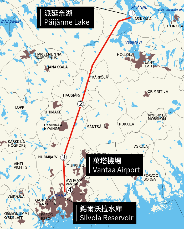 那麼廁所裡可生飲的自來水又是從何而來?經過我一番查詢後,發現機場的水管線是從位於芬蘭中部,同時也是境內第二大面積的「派延奈湖」裡取水引道而來,長達120公里的「派延奈輸水隧道」為芬蘭南部市鎮(包括赫爾辛基、埃斯波、萬塔、許溫凱、耶爾文佩、凱拉瓦、考尼艾寧、基爾科努米、錫博和圖蘇拉)超過百萬的居民提供淡水,隧道的終點位在大赫爾辛基地區萬塔市內的錫爾沃拉(Silvola)水庫,即取出的水會被抽至飲水處理工廠,由於水流一直是在低溫狀態下流過隧道,可以確保水質保存在良好的狀態,只要簡單的過濾淨化後即可以飲用。