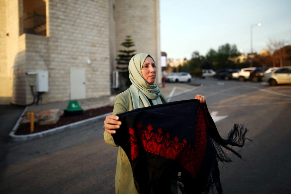 在以色列的拿撒勒(Nazareth),以色列國會中的第一位女性穆斯林議員、來自「阿拉伯共同名單黨」(Arab Joint List party)的卡提布(Iman Yassin Khatib),展示著手上一塊巴勒斯坦(Palestinian)傳統圍巾。