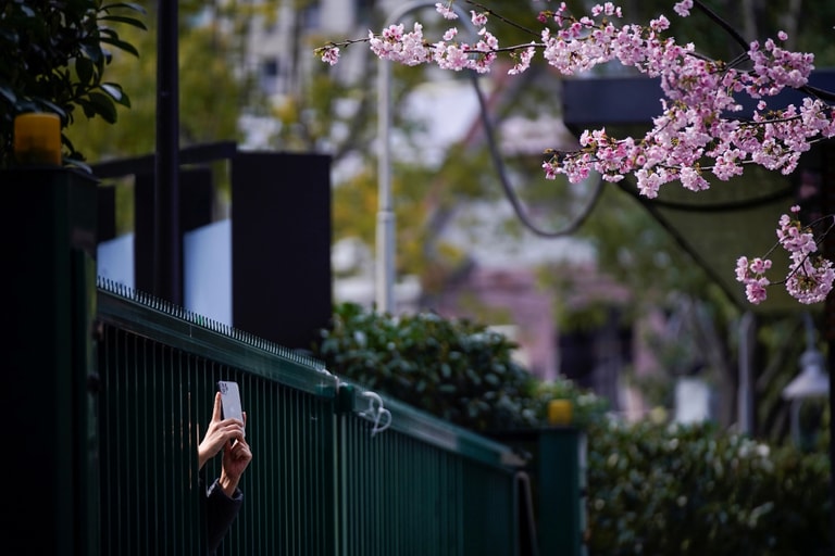 在中國上海,一名男子從因為疫情而封鎖的公園的圍牆外,拿出手機對著牆內的櫻花拍照。