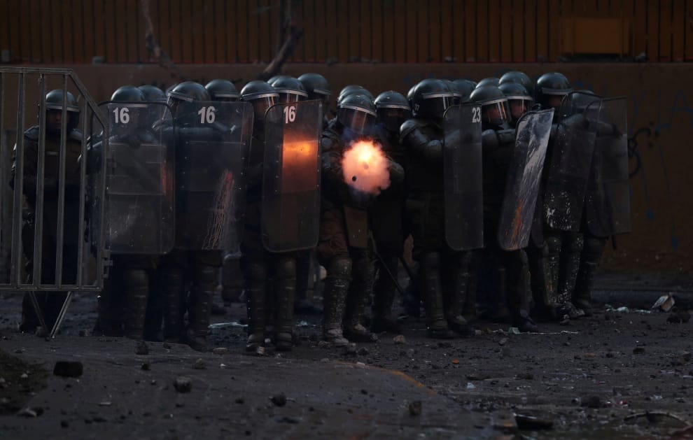 在智利聖地牙哥(Santiago)的街頭抗爭中,一隊警察掩護同袍向示威群眾發射催淚瓦斯。