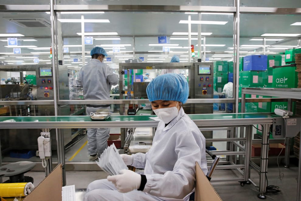 在南韓利川市(Icheon)的口罩工廠,一名員工在生產線上檢查身邊的口罩。