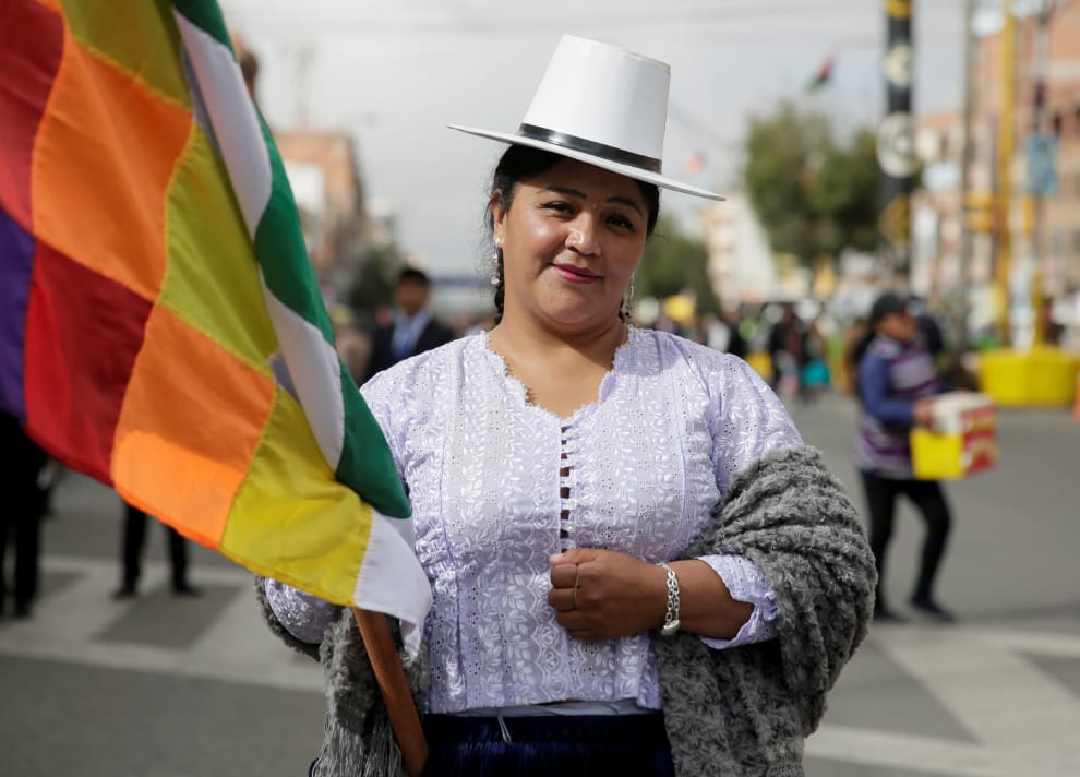 在玻利維亞第二大城愛爾阿脫(El Alto),一名女子帶著彩色旗走上街頭,參加慶祝該城建城 35周年的踩街活動。