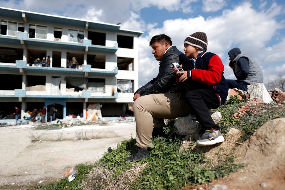 在土耳其北部的邊境小鎮埃迪爾內(Edirne),難民們坐在一棟廢棄的建築外,望著遠方。