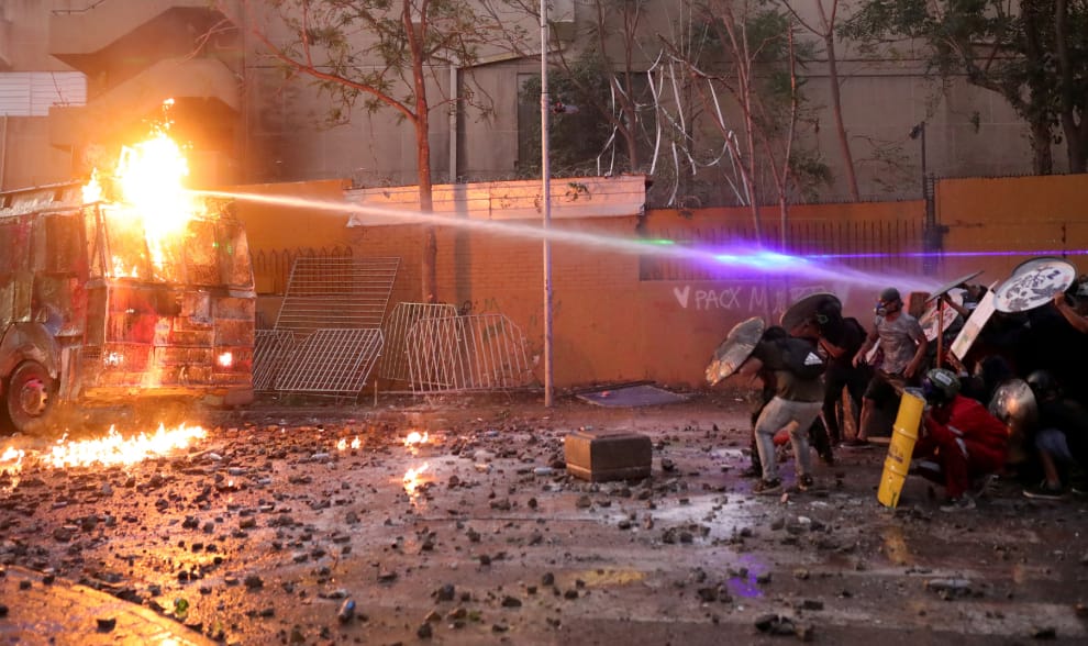 在智利的聖地牙哥(Santiago),一台起火的警察水砲車向示威民眾噴射水柱。
