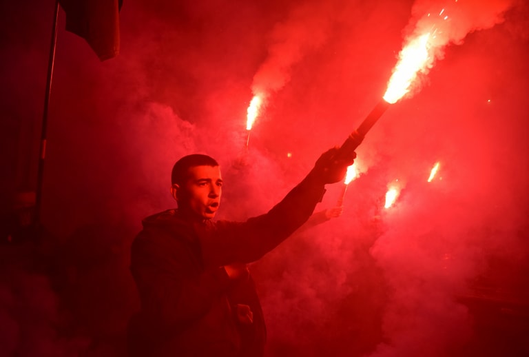 在烏克蘭的利沃夫(Lviv),烏克蘭民族主義組織的成員們上街參與一場紀念烏克蘭民族英雄—領導烏克蘭反抗軍(Ukrainian Insurgent Army)的羅曼·舒赫維奇(Roman Shukhevych)的 70歲冥誕活動。