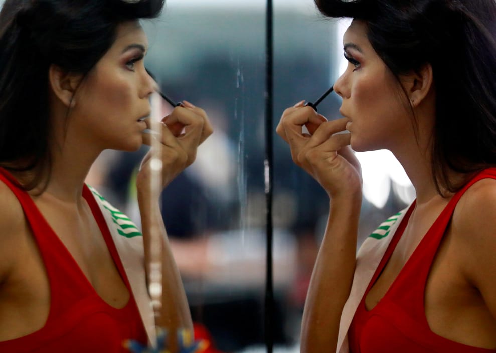 來自秘魯(Peru)的薩韋德拉(Nataly Saavedra),正對著鏡子化妝,希望能在決賽舞台上獲得評審的青睞。
