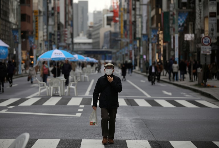 在日本東京銀座的林蔭大道上(Ginza Boulevard),一名戴著口罩的男性獨自走在周末禁止汽車通行的大道上。