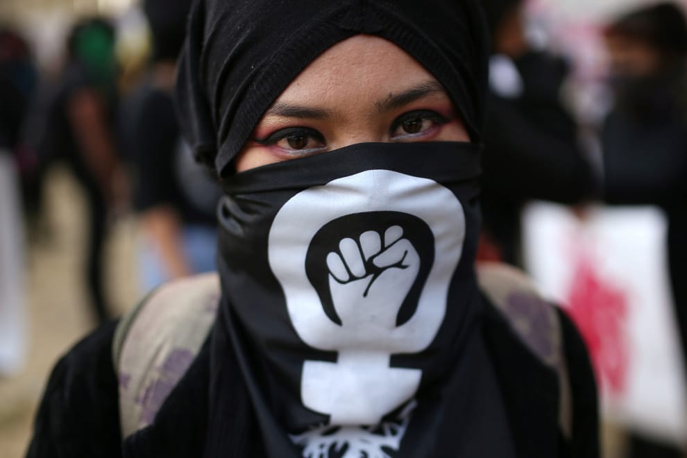在墨西哥的墨西哥市(Mexico City),一名女性在一場反對性別暴力和針對女性兇殺案的遊行中,配戴一條支持女性權利的圍巾。