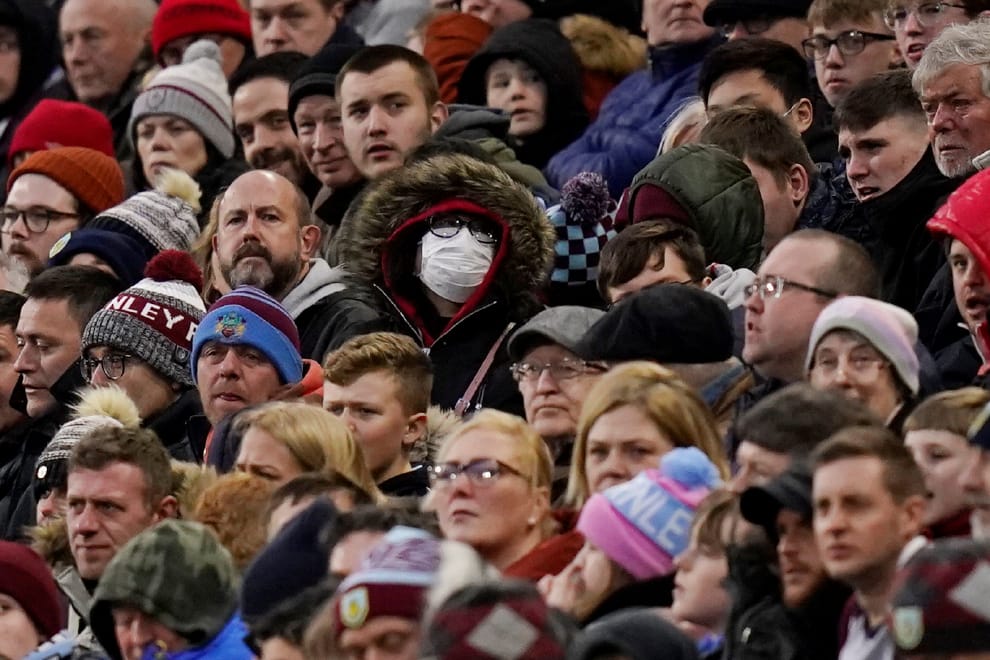 在英國伯恩利(Burnley)的一場足球賽中,攝影機捕捉到鏡頭範圍內唯一一名因COVID-19(武漢肺炎)擴散全球而戴上口罩的球迷。