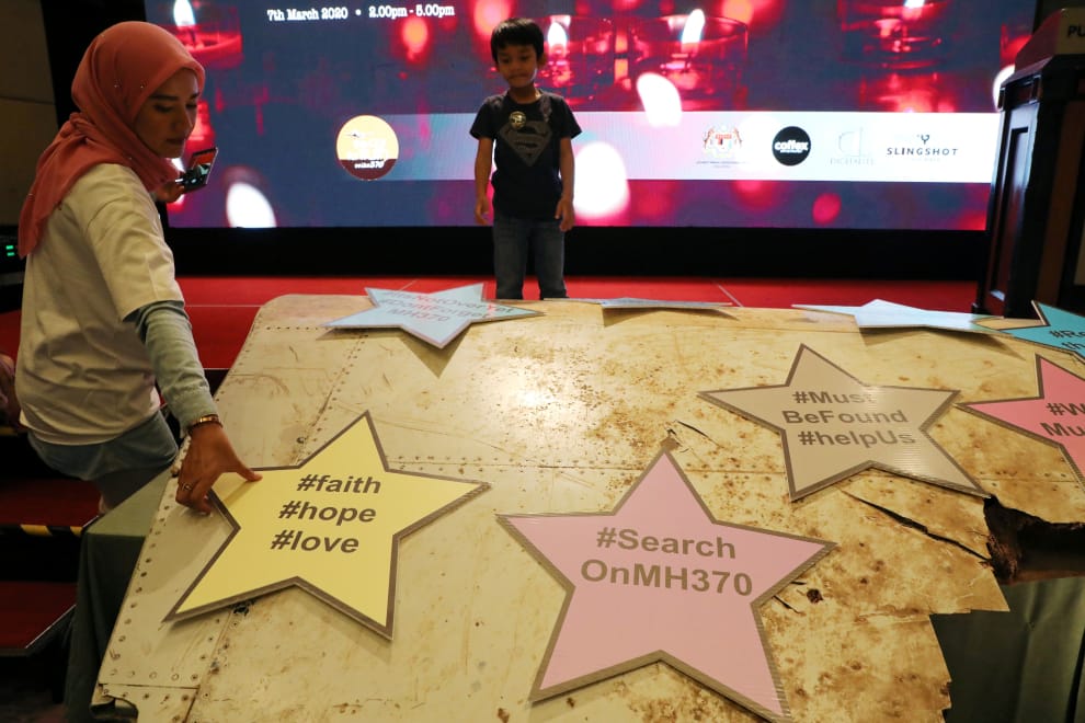 在馬來西亞的行政首都布城聯邦直轄區(Putrajaya),舉辦了一年一度的馬來西亞航空MH370的追悼紀念會。一名受難者家屬在紀念會中,拾起一塊象徵飛機殘骸的標示牌。