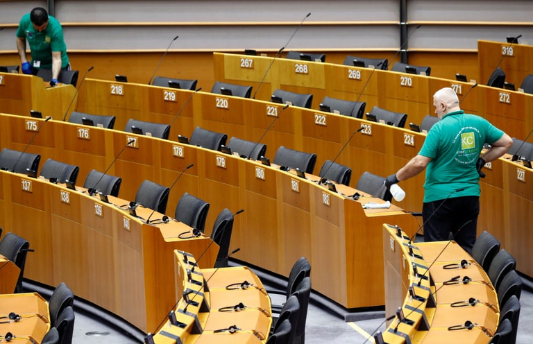 在比利時布魯塞爾(Brussels)歐洲議會的半圓形會議室裡,清潔人員在全體會議開始前,清潔每位議員的座位。