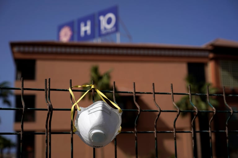 在西班牙的加那利群島 (Canary Islands),一個使用過的口罩懸掛在受疫情影響而封鎖的H10阿德赫海岸皇宮酒店(H10 Costa Adeje Palace hotel)外的鐵欄杆上。