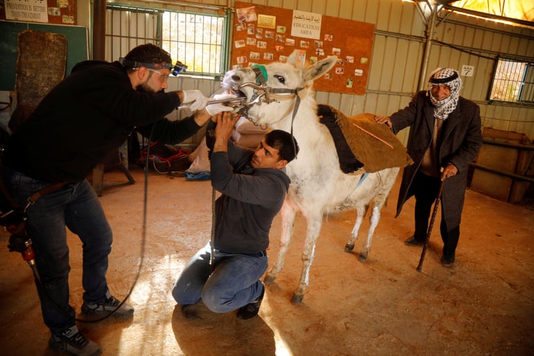 在約旦河西岸的以色列占領區那布魯斯(Nablus),英國慈善組織「讓驢子進天堂」的獸醫在一間庇護所中,幫一頭驢子檢查牙齒。