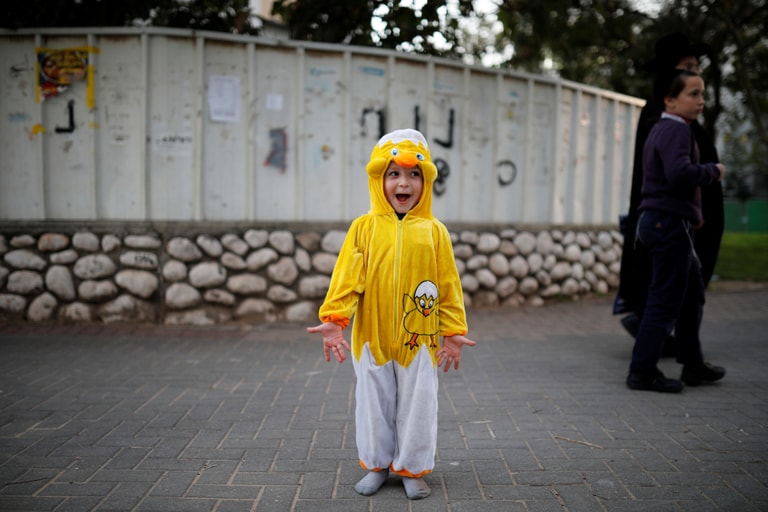 在以色列的阿什杜德(Ashdod),一位小男孩換上可愛的童裝,慶祝猶太教傳統節日普珥節(Purim)。