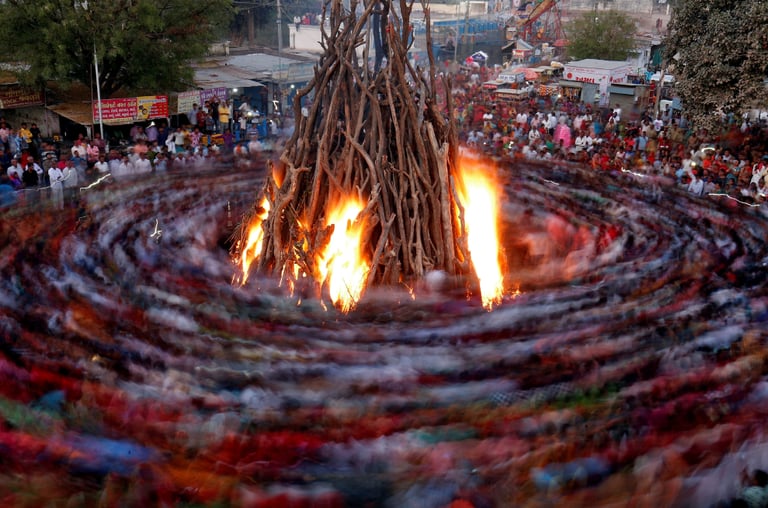在印度的艾哈邁達巴德(Ahmedabad),當地的印度教信徒在「燃燒Holika」(Holika Dahan)的儀式中,繞著燃燒的篝火轉圈。
