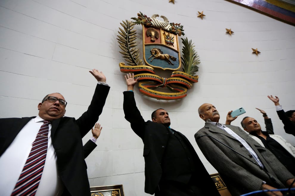 在委內瑞拉的首都卡拉卡斯(Caracas),政府所支持的國會議員在委內瑞拉國會大廈(Venezuela's National Assembly)中參與宣誓就職儀式。