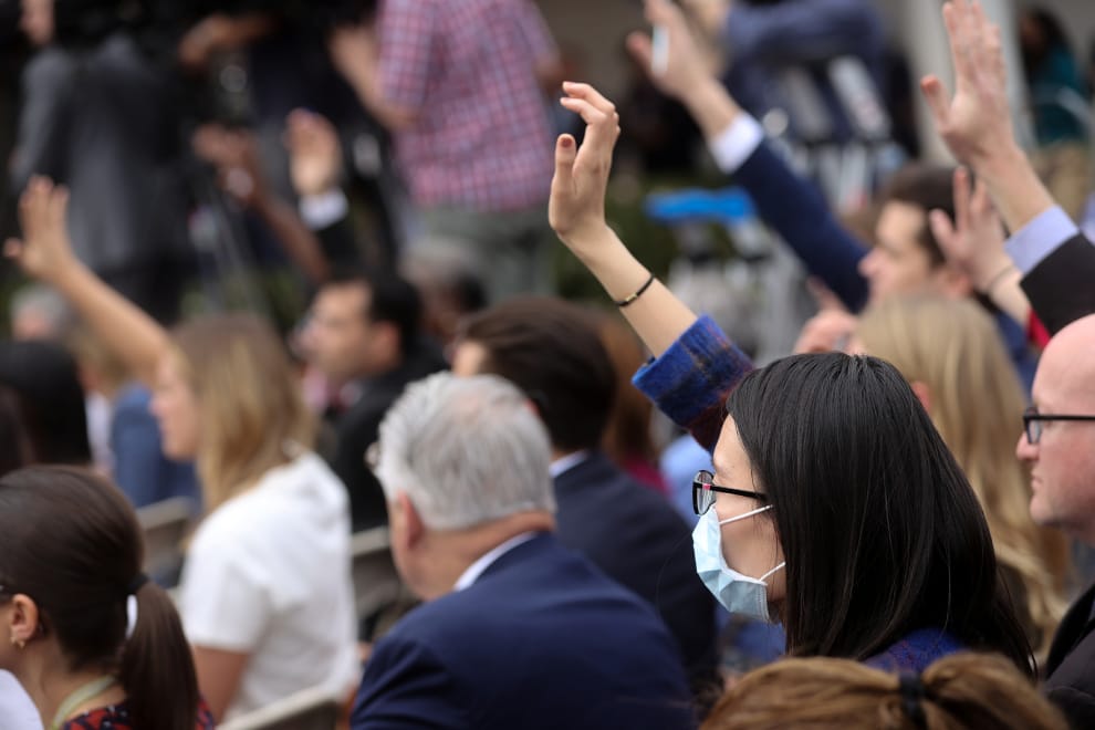 在美國華盛頓特區,美國總統川普(Donald Trump)召開COVID-19(武漢肺炎)疫情的記者會後,一名戴著口罩的記者高舉手臂準備發問。